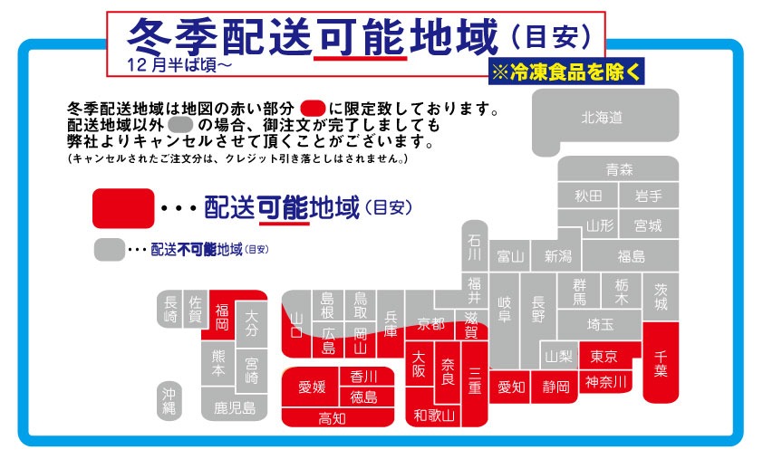 | 冬季配送地域(12月半ば頃から) | 下記地図の赤い地域 | 12月半ば頃から気候によって、変動の可能性あり |