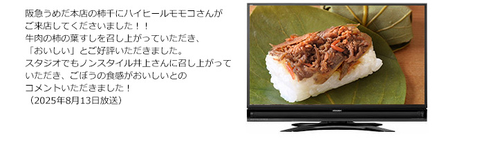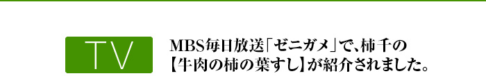 雨上がり決死隊のバラエティ番組「やまとナゼ?しこ」(朝日放送)に、当社経営の和食レストラン「天川茶寮 柿千」が登場。お笑いコンビ・スマイルの瀬戸洋祐さん、ウーイェイよしたかさんが来店し、今回ゲスト出演の社長様がいつも海外のお客様をお連れすると喜ばれるという、手創りの「極上 柿の葉すし」付ランチやデザートをお召しあがりいただきました(2014年9月30日放送)。